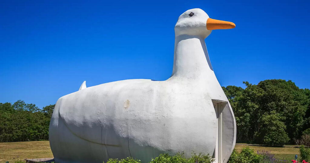 A ‘duck’ (named after the Big Duck, a duck-shaped farm shop selling poultry products in Long Island, NY) is a building in which form dominates function – “the architectural systems of space, structure, and program are submerged and distorted by an overall symbolic form.”