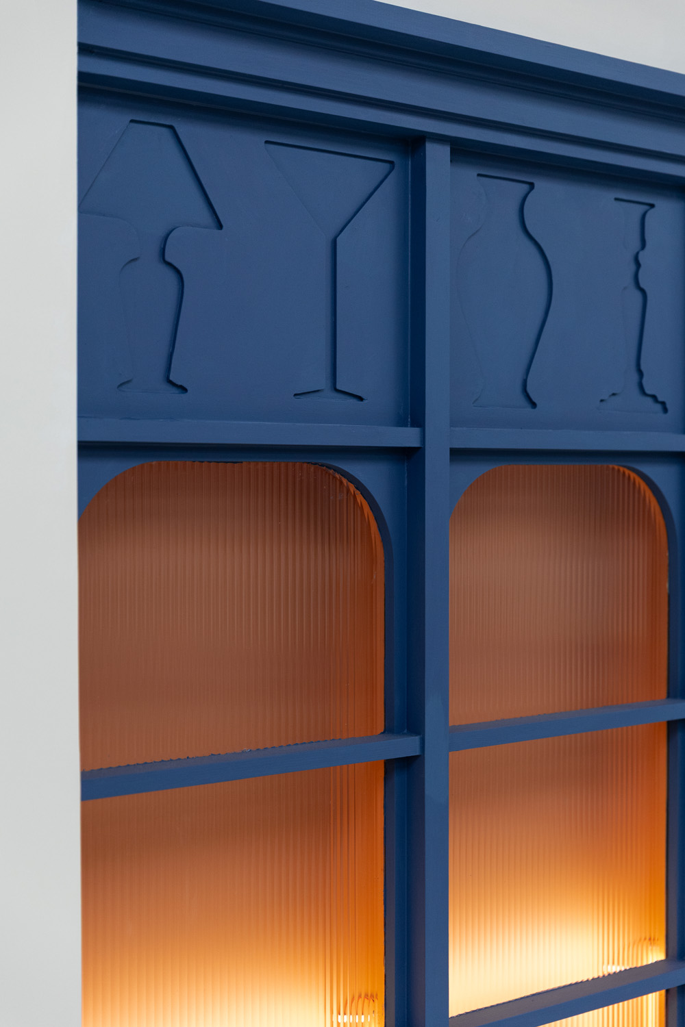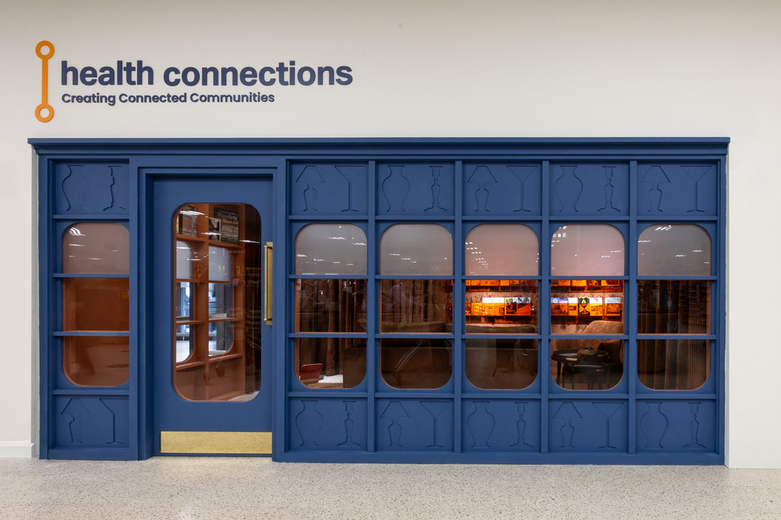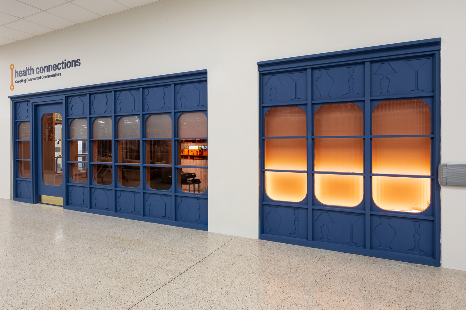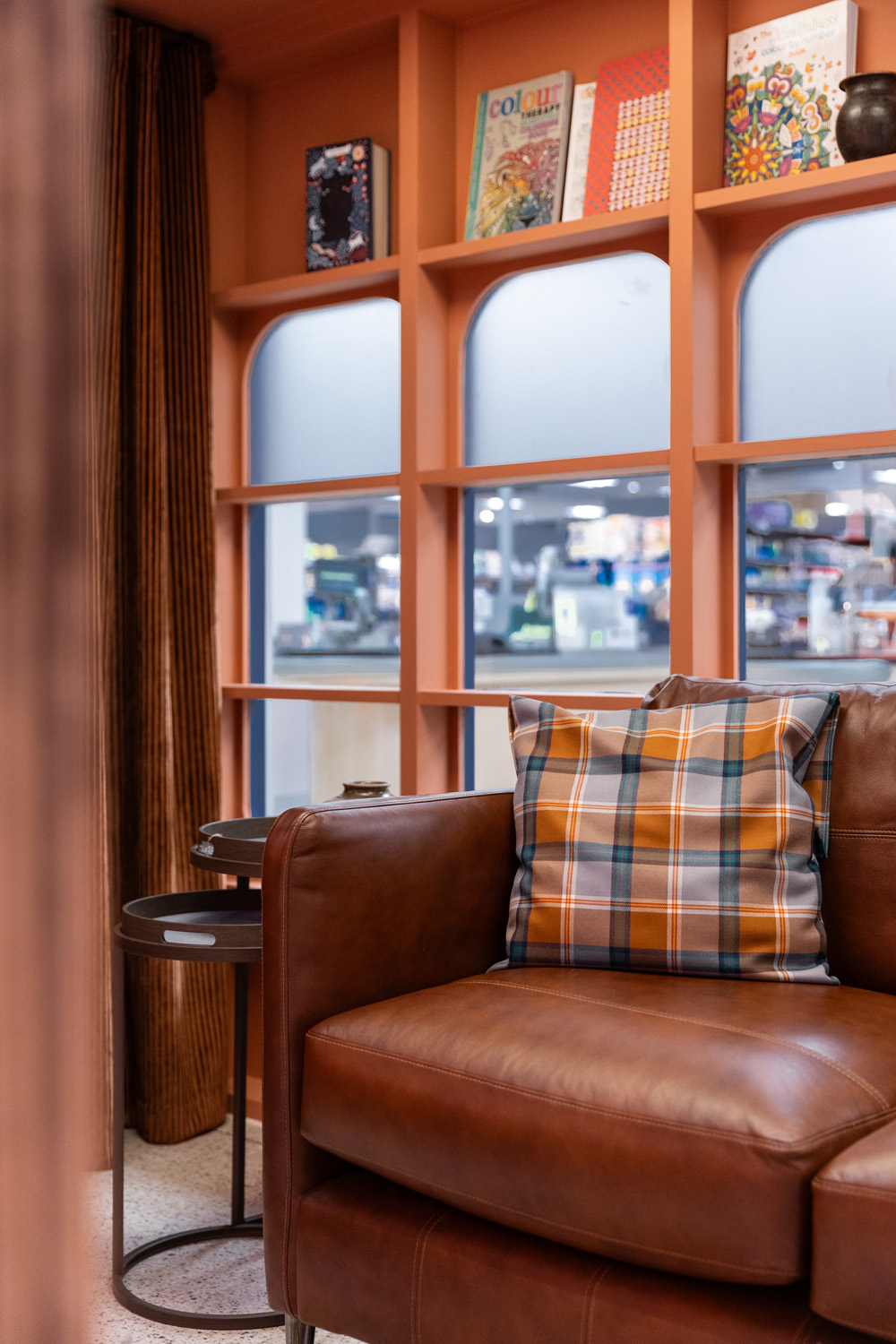 Viewed through a timber screen, evoking Victorian shopfronts and cosy train carriages, the warm and welcoming space contrasts with the harsh light and noise of the supermarket – the weary traveller enticed by the glowing hearth.